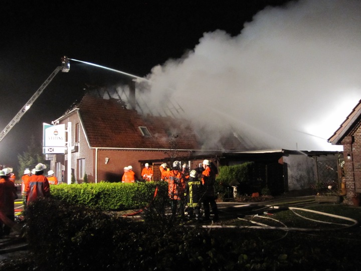 Beim Eintreffen brannte die Gaststätte bereits in voller Ausdehnung. Der Besitzer wurde durch seine Katzen geweckt und bemerkte Brandgeruch, worauf er mit seiner Frau und den Katzen das Haus verließ und die Feuerwehr gegen 02:25 Uhr alarmierte. Im Einsatz waren außerdem Kameraden der Wehren Altenhuntorf, Bardenfleth, Neuenbrok und die Drehleiter aus Brake.